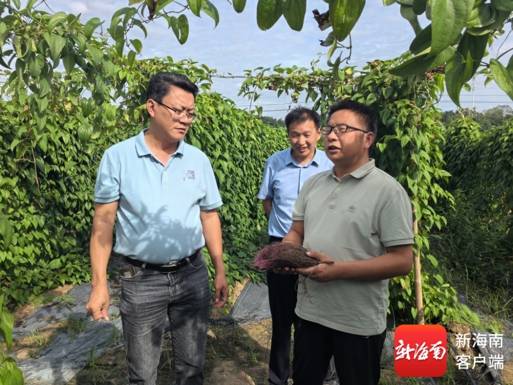 三亚市农业农村局、三亚市热带农业科学研究院相关负责人实地了解浅生定向栽培紫山药。记者 利声富 摄