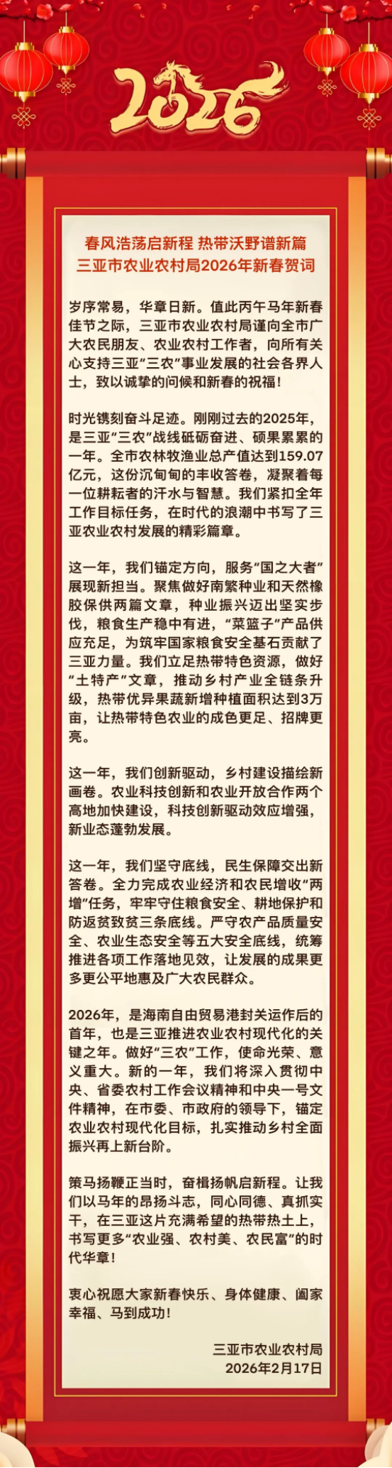 春风浩荡启新程 热带沃野谱新篇——三亚市农业农村局2026年新春贺词