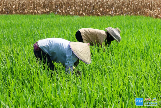 工人正在地里进行除草作业。