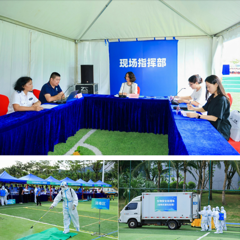 本次演练由省委国安办、省委网信办、省卫健委、省疾控局、省公安厅、省林业局、省交通厅、省市场监管局等省防控重大动物疫病指挥部成员单位、三亚市防灾减灾救灾和安全生产委员会动物疫病防控专项组等多家单位协同参与,全省各市县农业农村、综合行政执法等部门以及养殖企业代表共计360余人现场观摩。