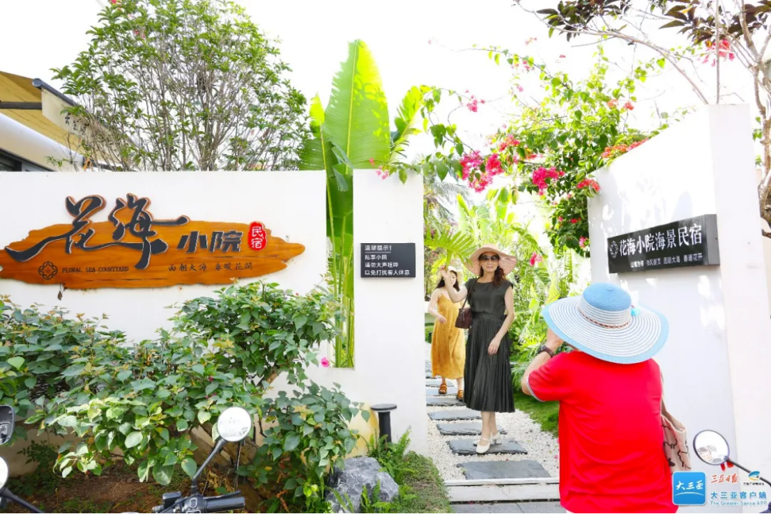 近日,游客在天涯小镇的特色民宿前打卡拍照。