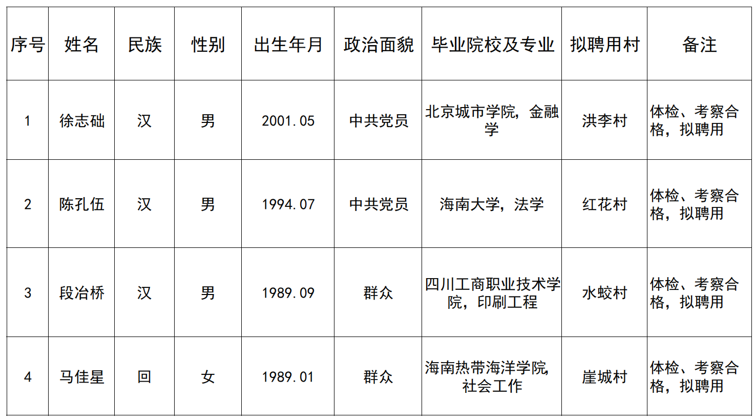 根据《“椰风海韵·振兴有你”三亚市乡村CEO招募令》,经初审、复审、初选会、竞聘上岗、体检、考察等环节,以及各试点村两委班子会议。经研究,确定徐志础、陈孔伍、段冶桥、马佳星同志为拟聘用人员。
